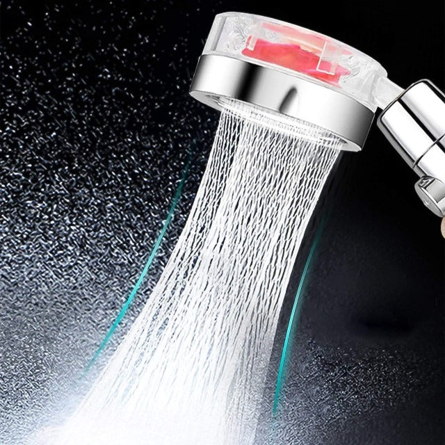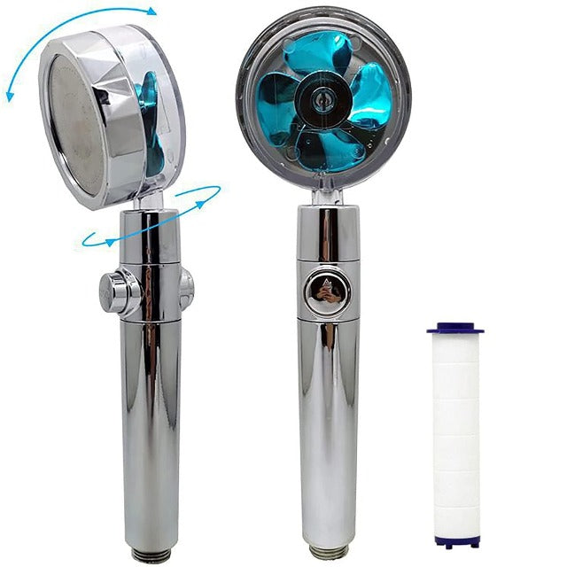 Grâce à son ventilateur turbo avec bouton d'arrêt de moulin à vent intégré, l'eau pénètre dans le pommeau de douche écologique SHOWRIN, mélangée à l'air et cela produit un fort débit d'eau. Une meilleure expérience de douche, appuyez simplement sur le bouton du pommeau de douche anti-calcaire, le débit d'eau s'arrête.